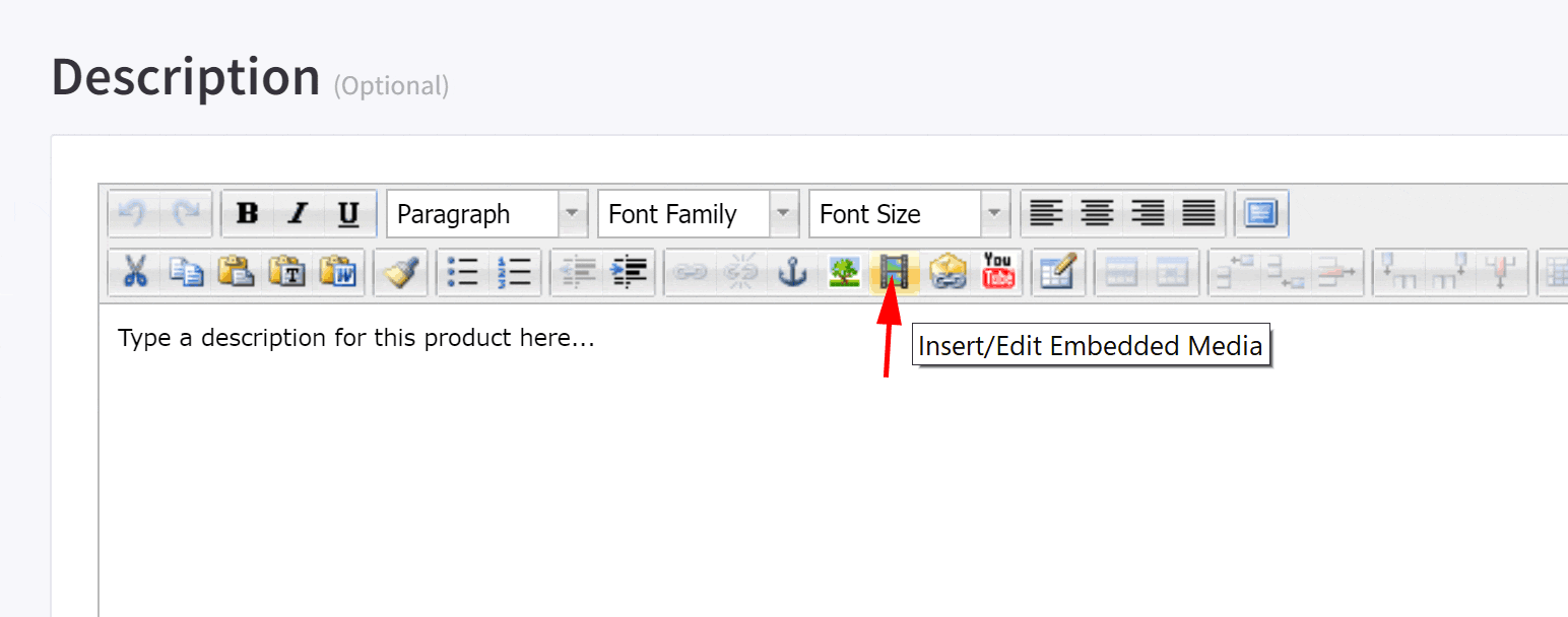Scroll down to the description editor, and click on the “Insert/Edit Embedded Media” button in the toolbar of the editor.
