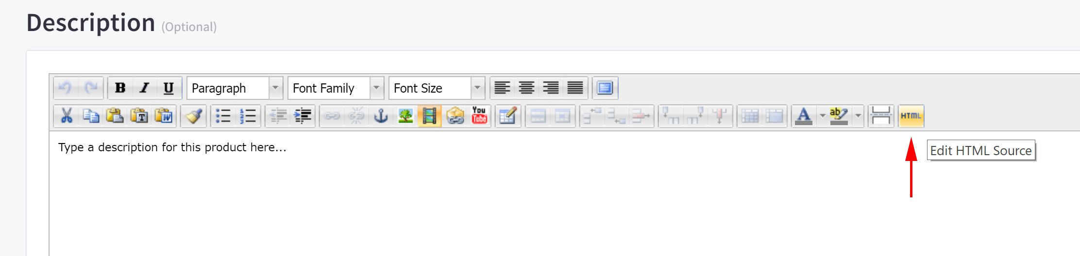 Scroll down to the description editor, and click on the “Insert/Edit HTML” button in the toolbar of the editor.