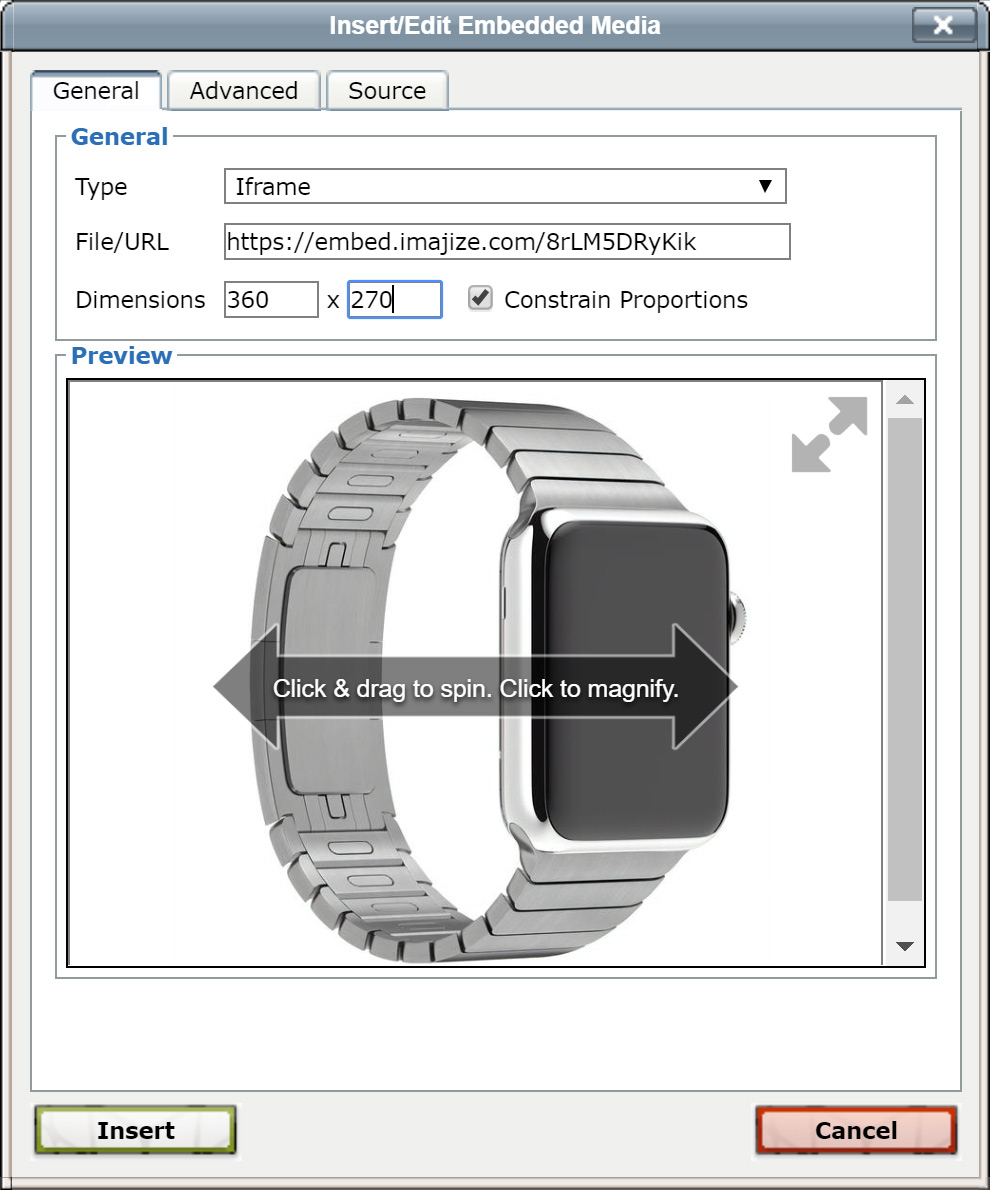 In the general tab, choose the type “Iframe” and paste the URL to the 360 view. The URL looks something like this: https://embed.spinshot.io/8rLM5DRyKik