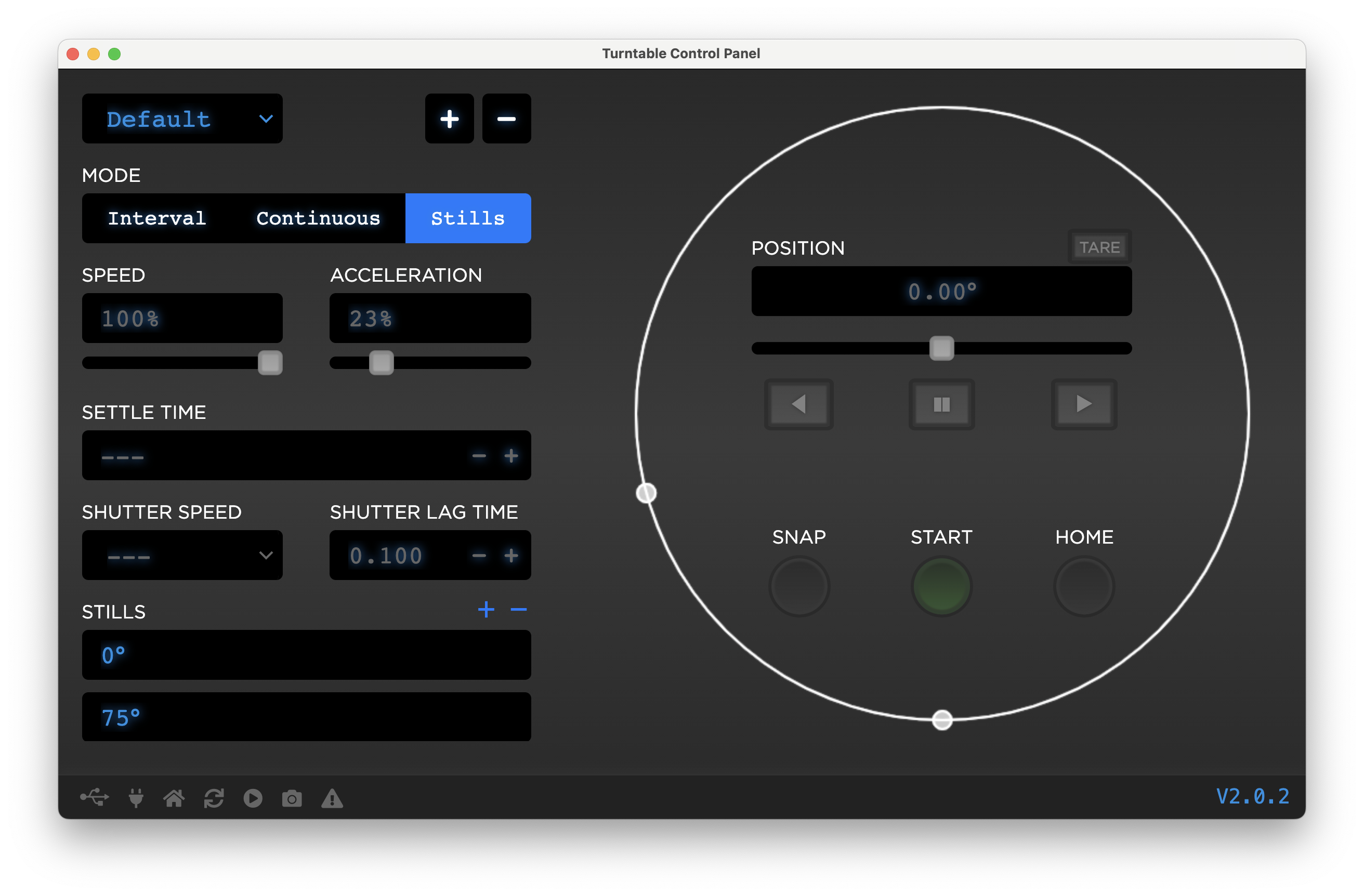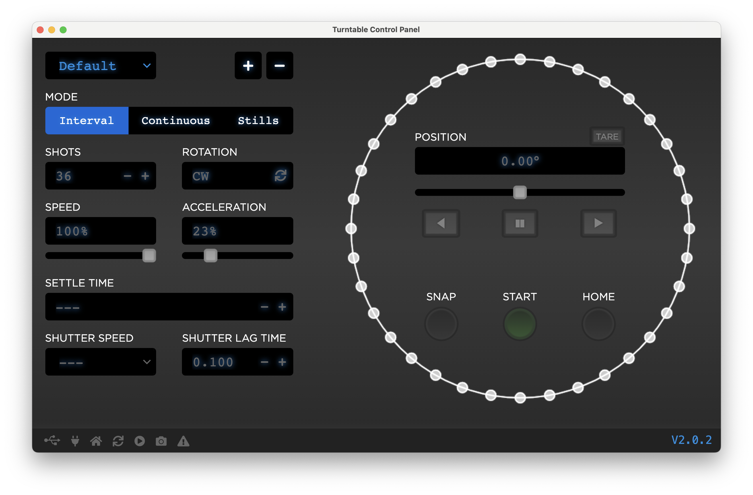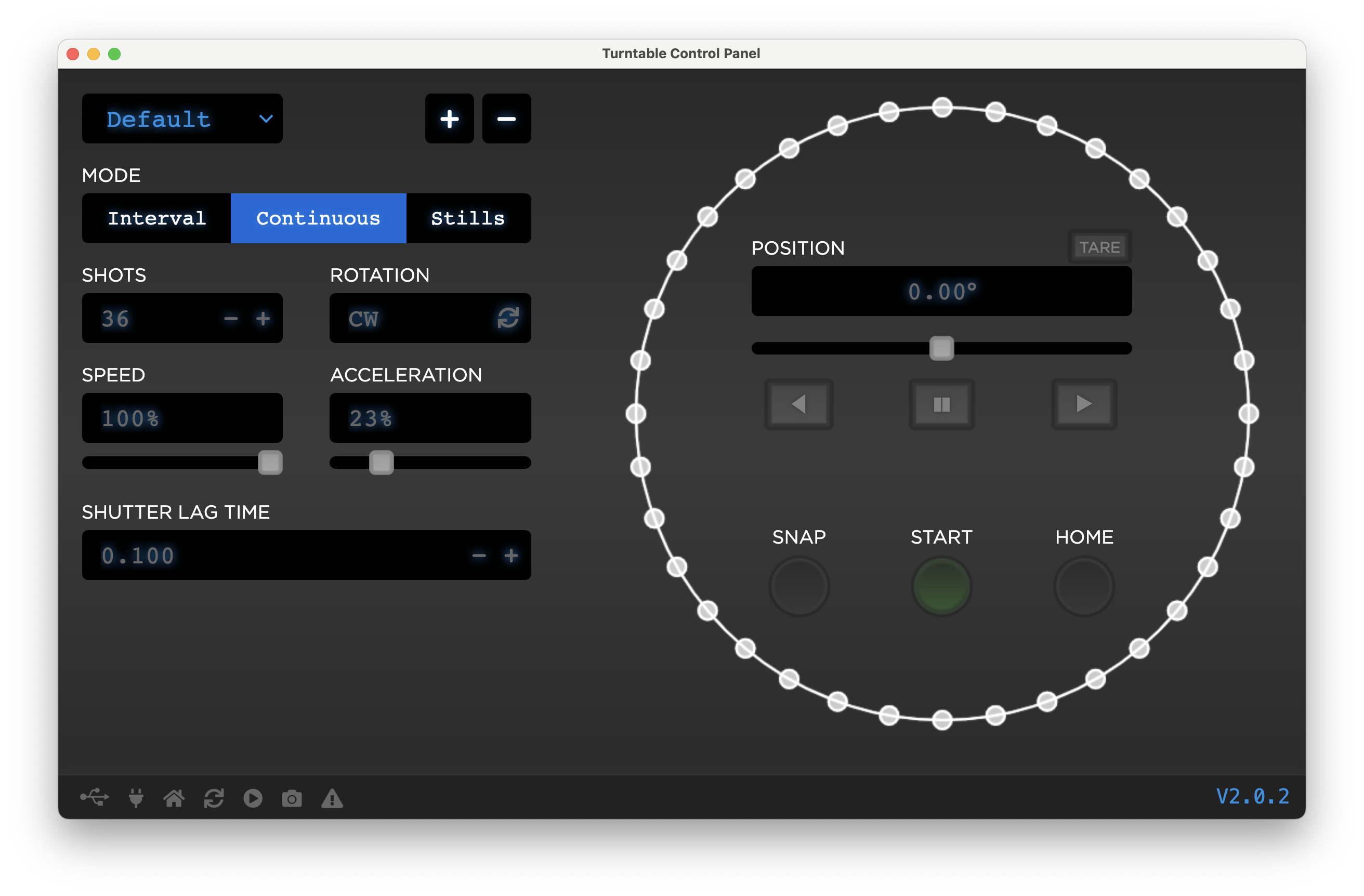Your turntable can operate in 3 modes. Interval, Continuous, and Stills. You can change the mode by clicking on the corresponding MODE tab.